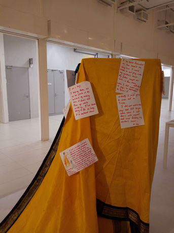 We made a saree installation, ROJA: WEAVING A WOMXN - transcripts and stories pinned to a giant weave made out of 9 sarees, donated by the womxn we interviewed. We invited the public to add their stories onto the installation with the prompt, “What does the saree mean to you?”. The installation was part of a larger exhibition that ran for 2 weeks and by the end of it, we collected over 72 responses. From their writings, the installation transformed into a space for confessions, dreams, heartbreak and hope - a safe space, something I always strive to achieve in all of my work.